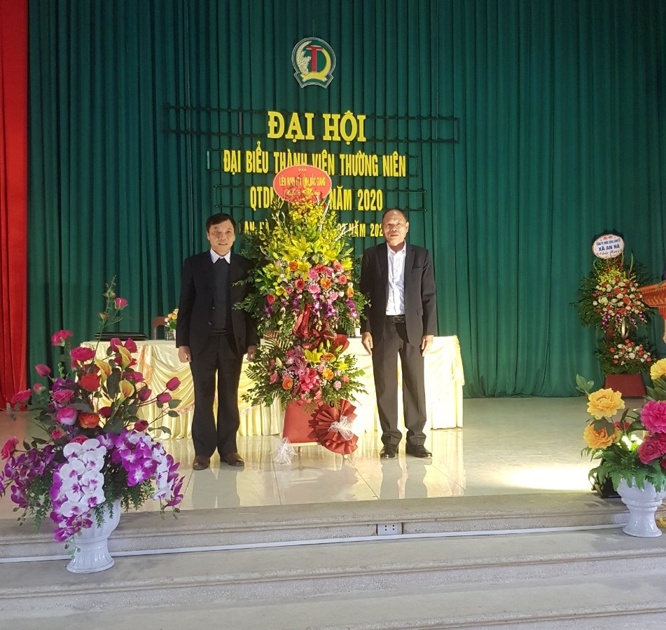 Đ/c Nguyễn Đức Hiền - Chủ tịch Liên minh HTX tỉnh Bắc Giang tặng hoa chúc mừng Đại hội Quỹ tín dụng nhân dân An Hà