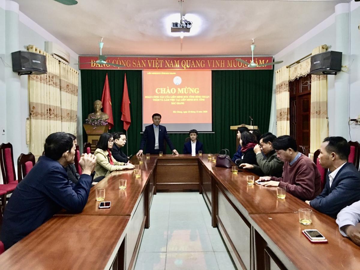 Tại buổi làm việc ông Nguyễn Đức Hiền, Chủ tịch Liên minh HTX tỉnh Bắc Giang đã nhiệt liệt chào mừng đoàn công tác Liên minh HTX tỉnh Bình Thuận đến thăm, làm việc với Liên minh HTX tỉnh Bắc Giang. Đồng thời thay mặt Liên minh HTX tỉnh Bắc Giang giới thiệu tóm tắt với đoàn công tác về tình hình kinh tế xã hội, lợi thế địa phương và một số sản phẩm chủ lực đặc trưng của tỉnh Bắc Giang như: sản phẩm gà đồi Yên Thế, vải thiều Lục Ngạn, mỳ Chũ, rượu Làng Vân…