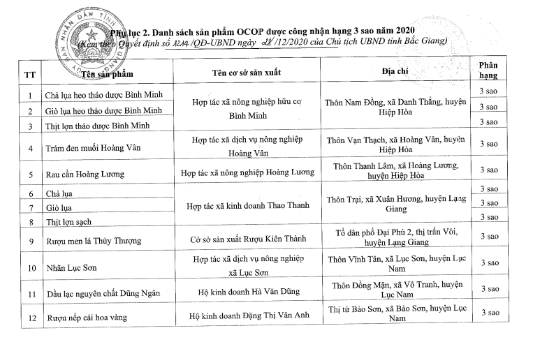 UBND tỉnh Bắc Giang vừa ban hành quyết định số 1214/QĐ-UBND ngày 28/12/2020 về việc phê duyệt kết quả đánh giá, phân hạng và cấp giấy chứng nhận cho sản phẩm tham gia Chương trình Mỗi xã một sản phẩm (OCOP) tỉnh Bắc Giang năm 2020.