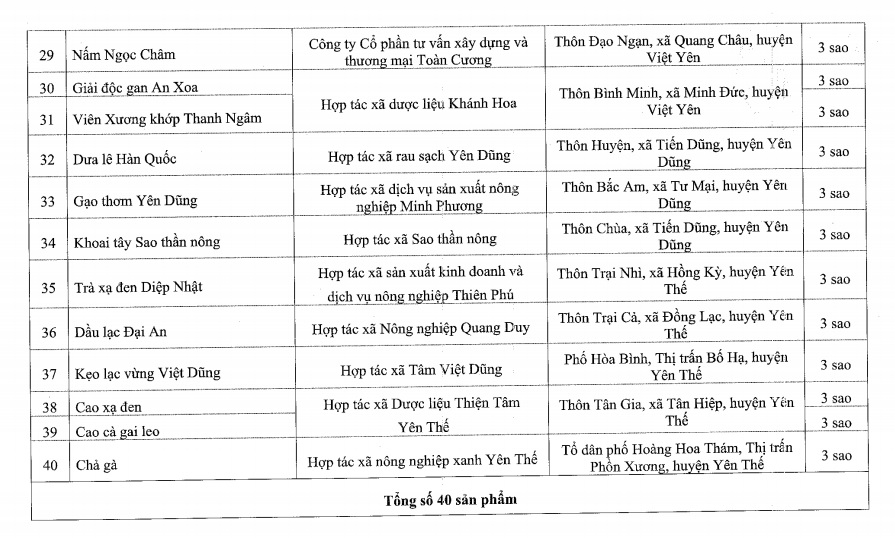 Danh sách 40 sản phẩm đạt hạng 03 sao gồm:
