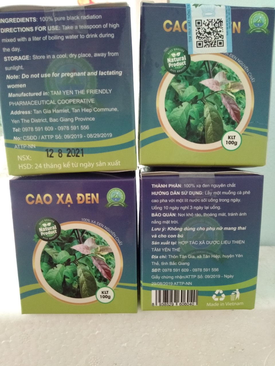 Sản phẩm cao xạ đen của HTX Dược liệu Thiện Tâm Yên Thế được sản xuất theo quy trình tiêu của HTX, cô đặc từ 100% thân cây, lá xạ đen nguyên chất không thêm phụ liệu, không chất bảo quản, đảm bảo chất lượng, an toàn vệ sinh thực phẩm. Sản xuất nguyên liệu chọn giống chuẩn được kiểm nghiệm chất lượng. Chọn đất sạch không bị ô nhiễm môi trường xa bãi rác thải vùng ô nhiễm công nghiệp, nông nghiệp, chăn nuôi, chế biến, giết mổ, đất nhiễm thuốc trừ sâu. Sau khi thu hoạch về nhặt sạch cỏ, rác sau đó đưa xạ đen nên dàn xịt nước cho thật sạch để cho ráo nước rồi mang đi băm và phơi khô sau đó mang vào nấu qua các công đoạn kéo dài trong bảy ngày bảy đêm, khi cao được thì đóng vào lo thủy tinh và dán tem sau đó cho vào hộp giấy. Cao Xạ Đen phải được nấu từ những cây xạ đen lâu năm từ 1 năm trở nên sẽ đem cho chất lượng tốt, các bạn không nên nấu những cây còn non khi thành cao sẽ không được chất lượng và trong quá trình nấu sẽ khó mất nhiều công sức.