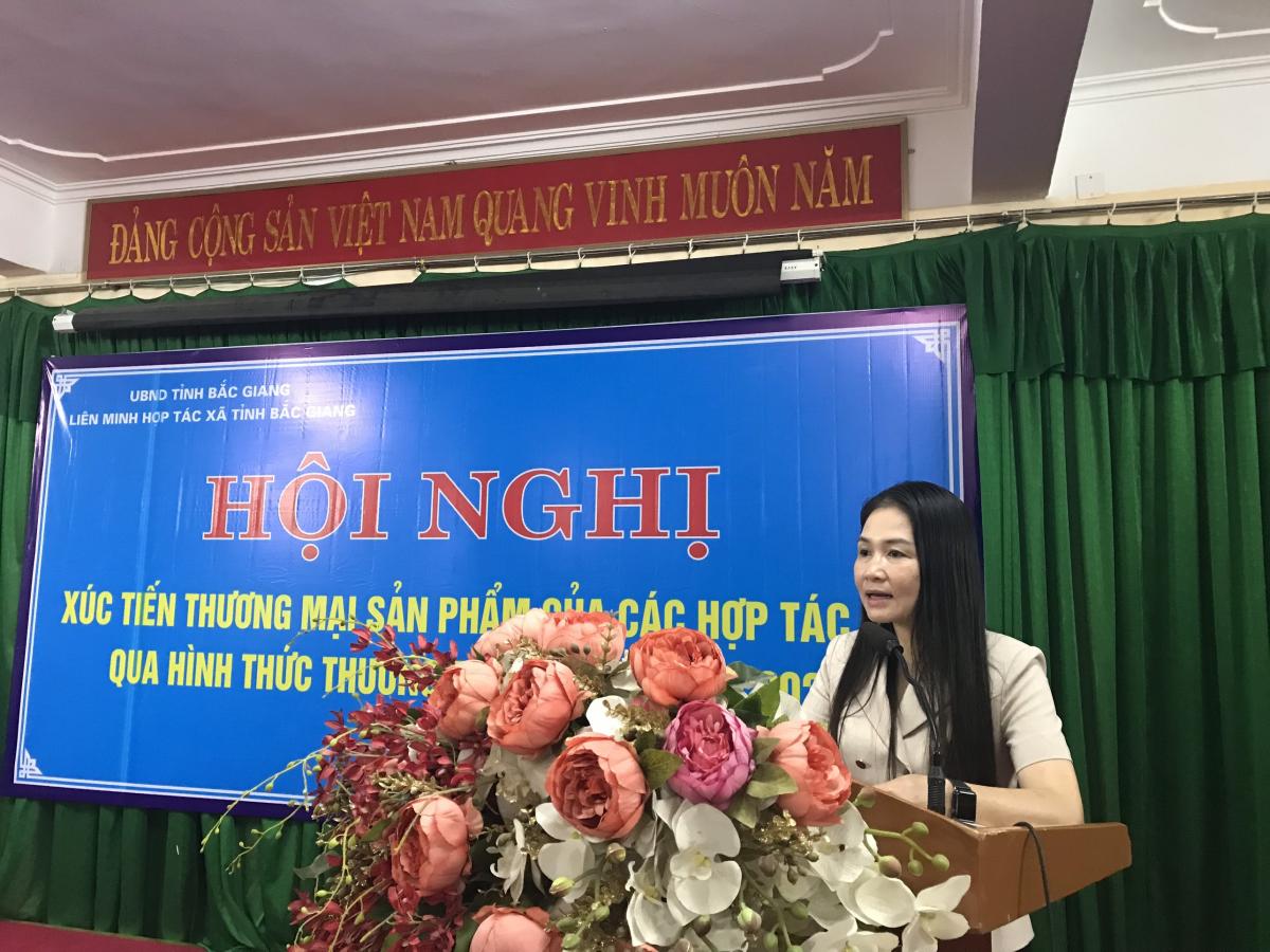 Phát biểu khai mạc tại hội nghị bà Nguyễn Thị Thúy Dung, Phó Chủ tịch Thường trực Liên minh HTX tỉnh cho biết, thời gian qua tình hình dịch Covid-19 diễn biến phức tạp ảnh hưởng tới hoạt động sản xuất, vận chuyển và tiêu thụ nông sản. Với mục đích cụ thể hóa và tổ chức thực hiện có hiệu quả chỉ đạo của Liên minh HTX Việt Nam, Tỉnh ủy, UBND tỉnh Bắc Giang về thực hiện “mục tiêu kép”, vừa phòng, chống dịch bệnh, vừa phát triển kinh tế - xã hội và hỗ trợ kết nối cung - cầu, tiêu thụ sản phẩm, hàng hóa cho các HTX, liên hiệp HTX trên địa bàn tỉnh Bắc Giang gắn với ứng dụng công nghệ thông tin, chuyển đổi số. Liên minh HTX tỉnh hỗ trợ các đơn vị thành viên kết nối cung cầu, tiêu thụ sản phẩm, hàng hóa qua phương thức thương mại điện tử (TMĐT).  Mục tiêu nhằm giúp các thành viên HTX, Liên hiệp HTX làm quen và thành thạo dần với việc giao dịch điện tử, từng bước chuyển đổi số để sản xuất và tiêu thụ sản phẩm hiệu quả trên tất cả các sàn giao dịch TMĐT thích ứng với tình hình dịch bệnh và phù hợp với tình hình mới.