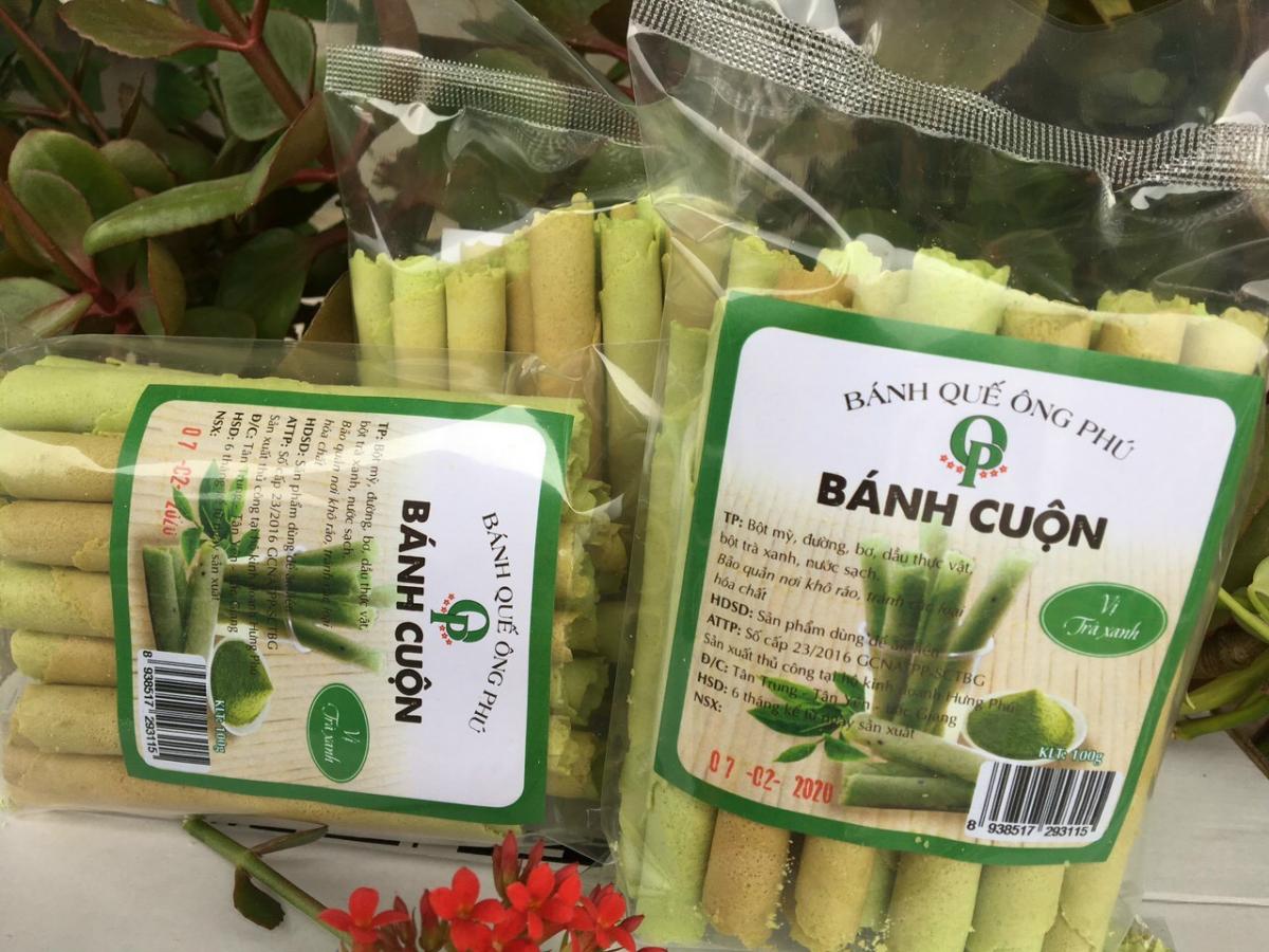 - Thông tin sản phẩm: Sản phẩm Bánh Quế Ông Phú do Hợp tác xã (HTX) Hưng Phú sản xuất, chế biến bảo đảm vệ sinh an toàn thực phẩm. Hiện nay sản phẩm Bánh Quế Ông Phú gồm có các dòng sản phẩm như: Bánh quế Ông Phú vị quế và vừng; Bánh quế Ông Phú vị dừa và vừng; Bánh cuộn vị quế và vừng; Bánh cuộn vị dừa và vừng.