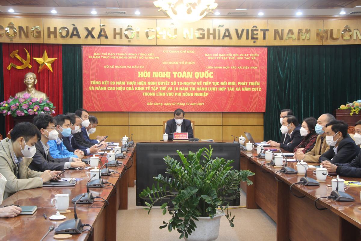 Sáng ngày 7/12, Liên minh Hợp tác xã (HTX) Việt Nam phối hợp Bộ Kế hoạch và Đầu tư tổ chức hội nghị tổng kết 20 năm thực hiện Nghị quyết số 13-NQ/TW của Ban Chấp hành Trung ương Đảng về tiếp tục đổi mới, phát triển và nâng cao hiệu quả kinh tế tập thể (KTTT); tổng kết 10 năm thi hành Luật HTX năm 2012 trong lĩnh vực phi nông nghiệp theo hình thức trực tuyến và trực tiếp. Chủ trì hội nghị có đồng chí Đỗ Văn Chiến, Bí thư Trung ương Đảng, Chủ tịch Uỷ ban Trung ương Mặt trận Tổ quốc Việt Nam; đồng chí Hầu A Lềnh, Bộ trưởng, Chủ nhiệm Uỷ ban Dân tộc; Đồng chí Nguyễn Duy Hưng, Phó Trưởng Ban Kinh tế Trung ương; đồng chí Võ Thành Thống, Thứ trưởng Bộ Kế hoạch và Đầu tư; đồng chí Nguyễn Ngọc Bảo, Chủ tịch Liên minh Hợp tác xã Việt Nam và 63 điểm cầu tại Tỉnh uỷ, UBND tỉnh, thành phố trong cả nước.