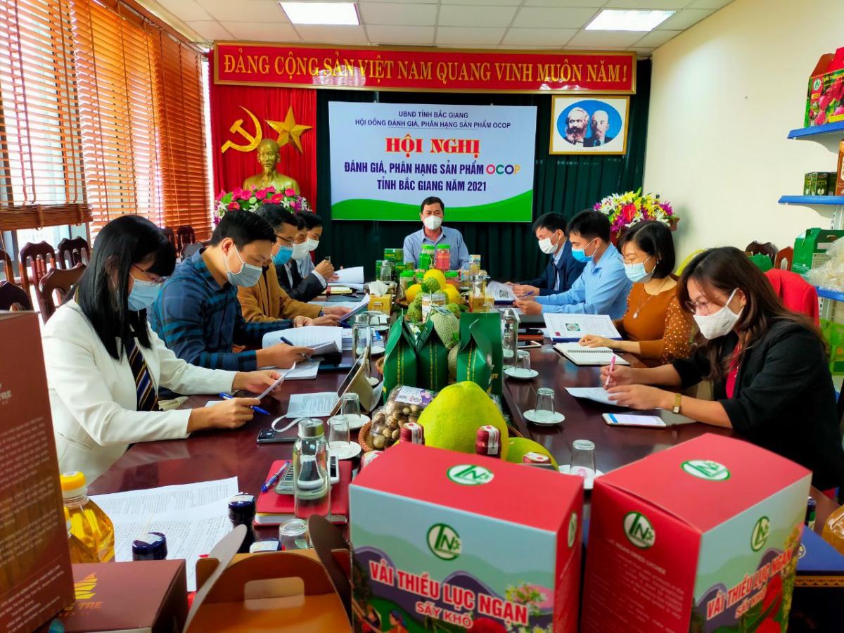 Quang cảnh Hội nghị đánh giá chấm điểm các sản phẩm tham gia Chương trình OCOP năm 2021 trên địa tỉnh Bắc Giang.