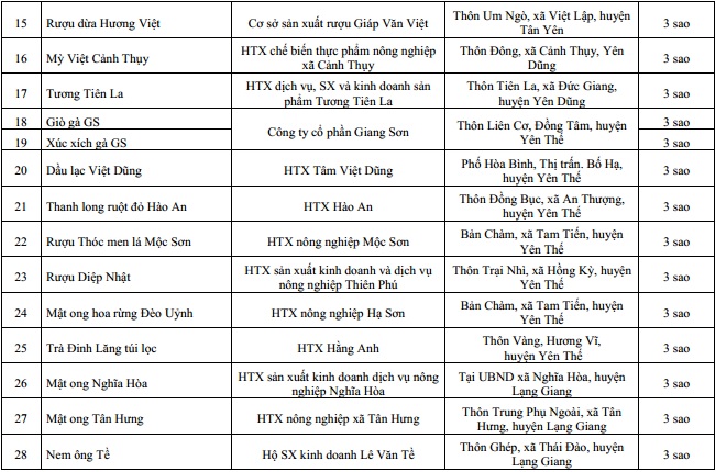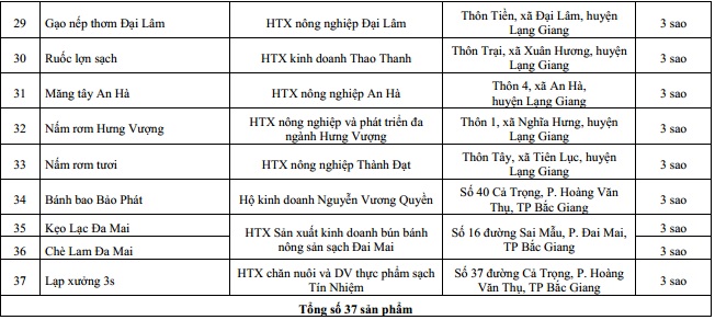 Theo đó, UBND tỉnh đã cấp Giấy chứng nhận sản phẩm OCOP tỉnh Bắc Giang cho 39 sản phẩm. Trong đó công nhận có 2 sản phẩm đạt hạng 4 sao là sản phẩm Dưa kim Hoàng Hậu của HTX rau sạch Yên Dũng và sản phẩm Sâm nam núi Dành khô của HTX sản xuất và tiêu thụ Sâm nam núi Dành.