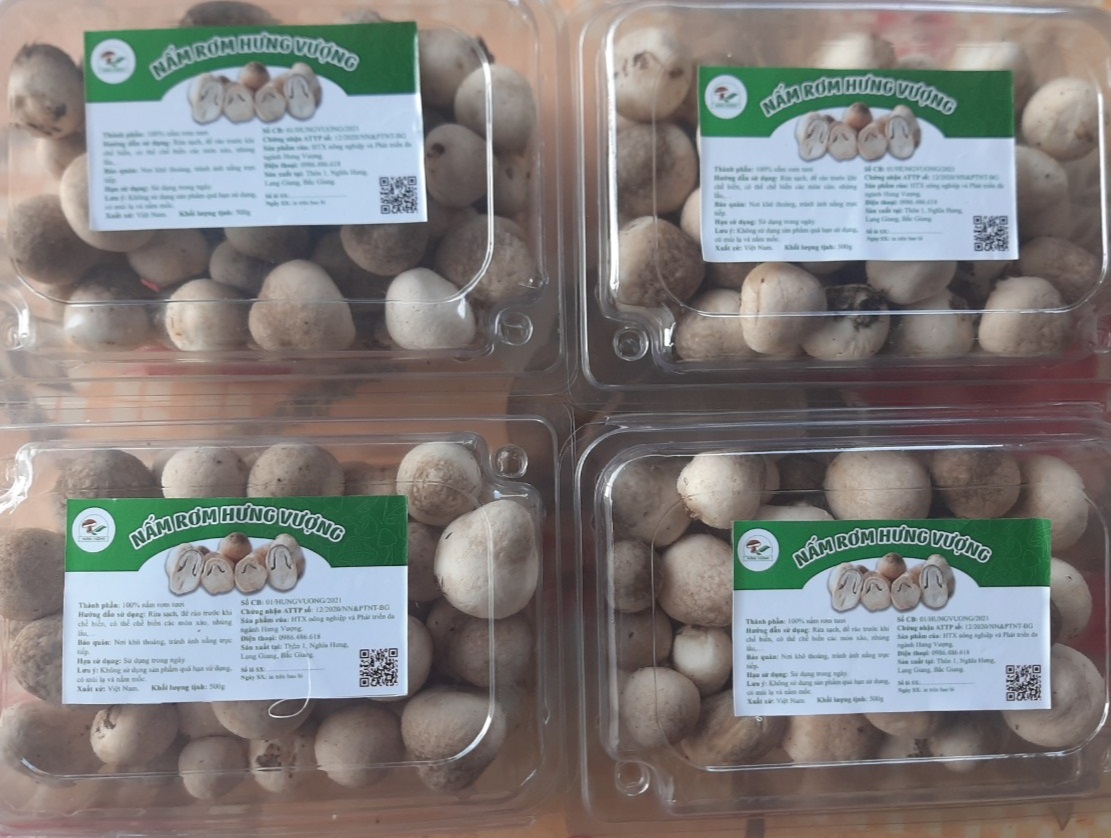 Nấm rơm của HTX nông nghiệp và phát triển đa ngành Hưng Vượng được sản xuất trong nhà kím, đóng gói dưới dạng hộp và túi lưới đạt tiêu chuẩn, chất lượng cao. Nấm được sản xuất hoàn toàn tự nhiên trên các nguyên liệu rơm, dạ màn của cây cao su, cây keo và các bột đậu tương, bột ngô, bột cám thóc cho phối trộn, ủ đống và lên gian kệ; hấp thanh trùng trong nhiệt độ 100 độ C, hơi nước trong vòng 5h đồng hồ. Đây là sự cố gắng không ngừng nghỉ của HTX nông nghiệp và phát triển đa ngành Hưng Vượng do ông Đồng Văn Điệp làm Chủ tịch HĐQT kiêm Giám đốc và bà Nguyễn Thị Nhung làm Phó Giám đốc nghiên cứu và thực hiện.