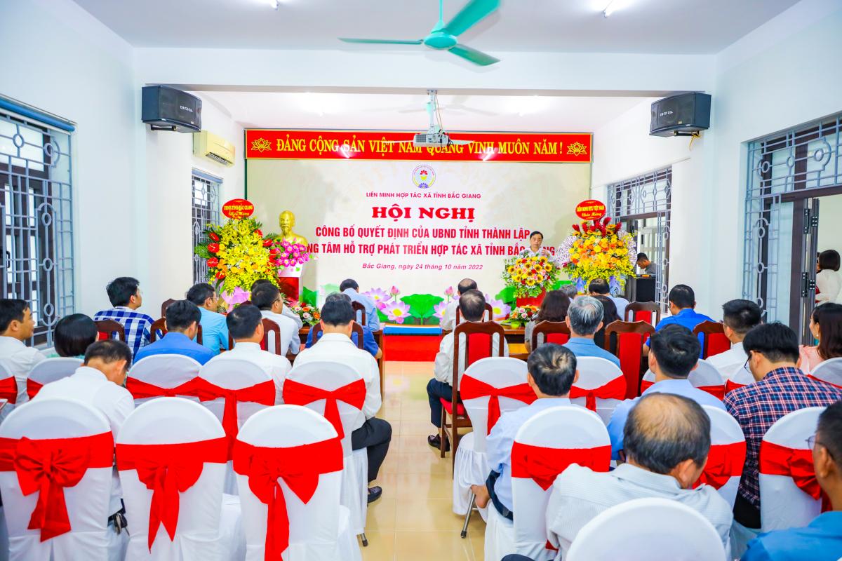 Thực hiện Chương trình công tác năm 2022, được sự nhất trí của lãnh đạo UBND tỉnh. Chiều ngày 24/10/2022, Liên minh HTX tỉnh Bắc Giang tổ chức Hội nghị công bố Quyết định của UBND tỉnh thành lập Trung tâm Hỗ trợ phát triển Hợp tác xã tỉnh Bắc Giang. Dự và chỉ đạo Hội nghị có đồng chí Nguyễn Ngọc Bảo, Bí thư Đảng đoàn, Chủ tịch Liên minh HTX Việt Nam; đồng chí Phan Thế Tuấn, Phó Chủ tịch UBND tỉnh – Trưởng Ban Chỉ đạo phát triển KTTT tỉnh. Tham dự Hội nghị có các đồng chí lãnh đạo các sở, ngành, đoàn thể của tỉnh; Thường trực, Ủy viên Ban Thường vụ, Ban Chấp hành, Liên minh HTX tỉnh khóa VI; lãnh đạo UBND các huyện, thành phố và một số HTX có sản phẩm OCOP, sản phẩm đặc trưng trên địa bàn tỉnh.