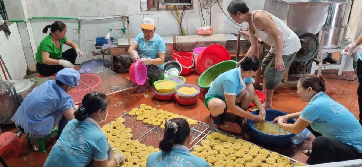Thành viên HTX trong quá trình chế biến bún khô gấc Đa Mai