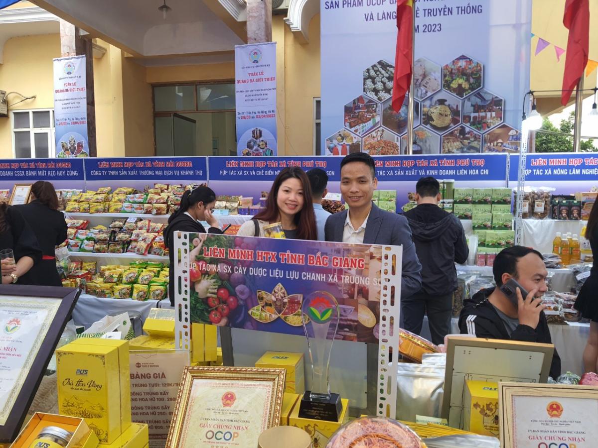 Liên minh HTX tỉnh Bắc Giang tổ chức cho 02 HTX đang tham gia thực hiện “Đề án ứng dụng công nghệ 4.0 trong quản lý điều hành hoạt động sản xuất kinh doanh và HTX nông nghiệp khởi nghiệp ứng dụng công nghệ cao trên địa bàn tỉnh Bắc Giang giai đoạn 2015-2025” tham dự Tuần lễ với 18 sản phẩm nông sản, dược liệu chế biến, sản phẩm OCOP được cấp chứng nhận từ 3 đến 4 sao có tiềm năng xuất khẩu như: Nụ Trà hoa vàng, Trà hoa vàng túi lọc, Nấm linh chi, các sản phẩm Đông trùng hạ thảo, Mật ong của HTX sản xuất cây dược liệu Lựu Chanh xã Trường Sơn; dưa baby, cà chua bi, cà chua Mỹ, bí ngô và các sản phẩm rau ăn lá của HTX rau sạch Yên Dũng.