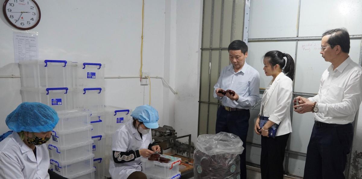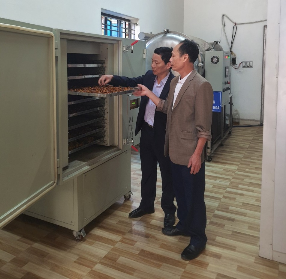 Ông Nguyễn Đức Hiền, Chủ tịch Liên minh HTX tỉnh Bắc Giang thăm khu vực chế biến sản phẩm Trà hoa vàng của HTX dược liệu công nghệ cao Trường Sơn, huyện Lục Nam