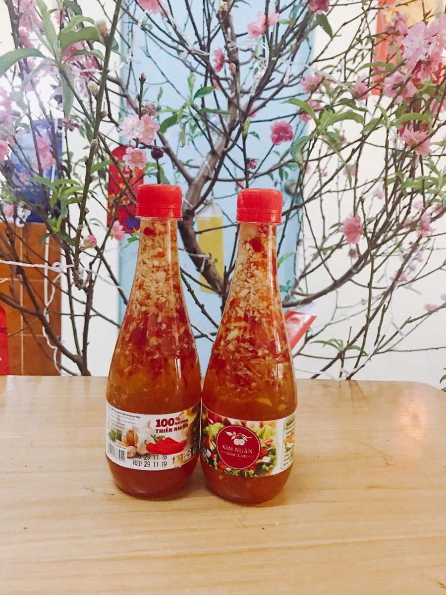 - Thông tin sản phẩm: Giấm tỏi ớt Kim Ngân, sản phẩm kết hợp từ 70% giấm vải 30% giấm táo mèo cùng tỏi tía của Lục Nam Bắc Giang, ớt thóc từ Lục ngạn Bắc Giang và ớt sừng từ Đà Lạt.