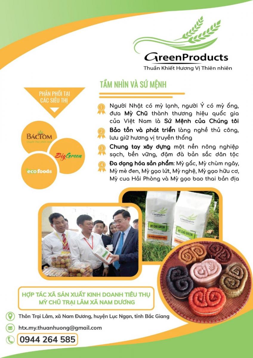 - Thông tin sản phẩm: Mỳ Chũ Green được sản xuất bằng 100% kinh nghiệm, bí quyết gia truyền từ cha ông để lại. Sản phẩm được làm hoàn toàn từ nguồn gạo thơm ngon, không sử dụng các tạp chất, chất bảo quản.